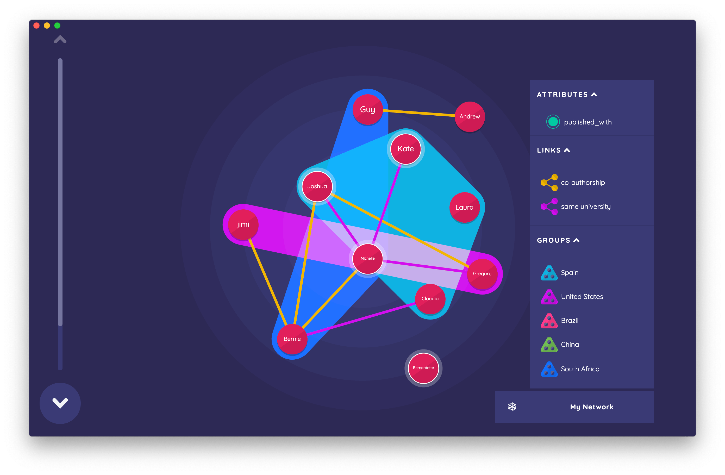 On the "Narrative" Interface, alter edges, group and individual attribute variables can be displayed to elicit qualitative data from the participant about their network. Configured presets can be toggled on and off to reveal colored convex hulls representing group variables, highlighted nodes representing attribute data, and different edge types in the network. No data is collected on this Interface.