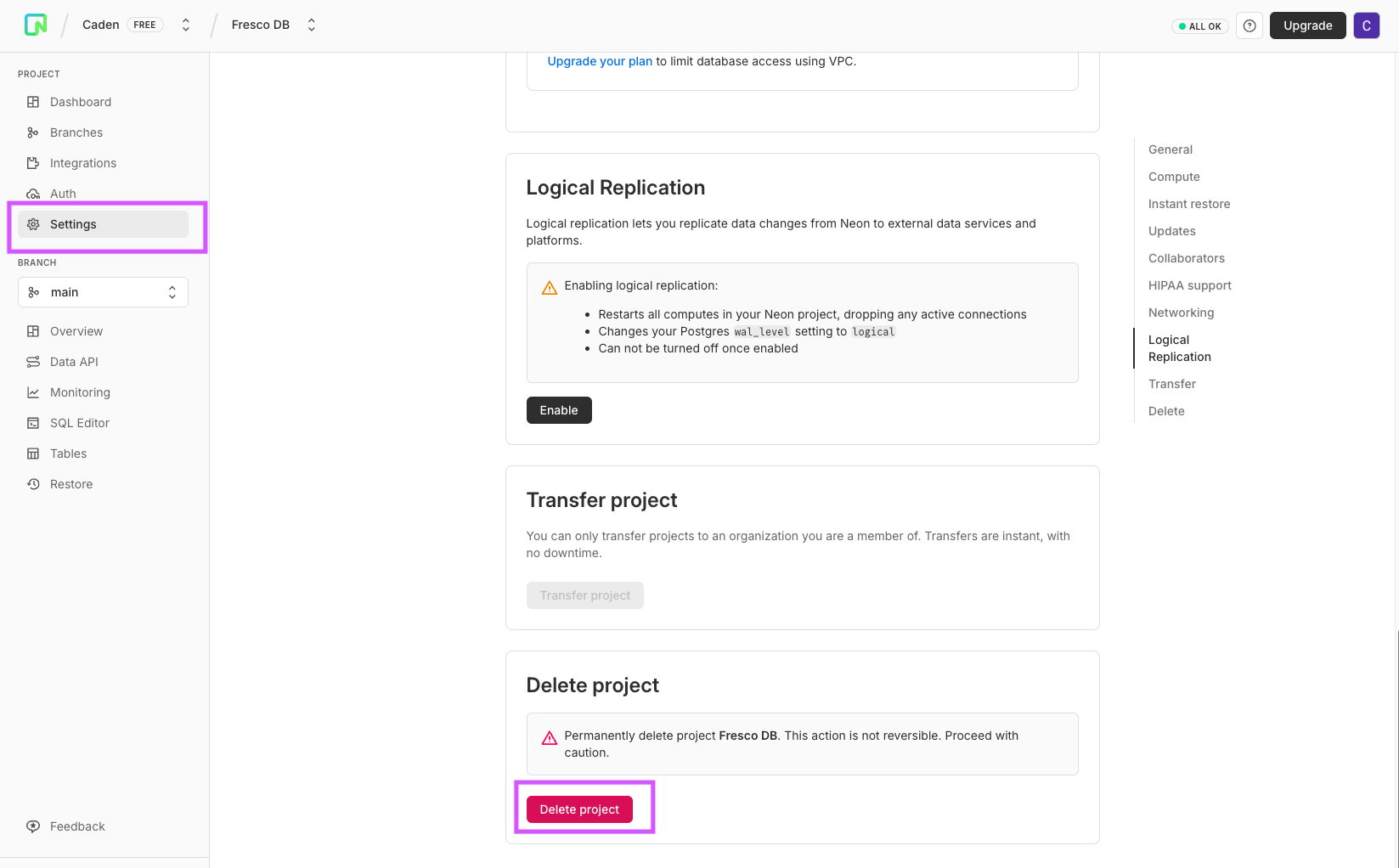Navigate to your Neon dashboard and select your project.